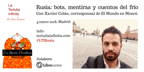 El jueves 4 de enero a las 20.00 horas estaremos en la champañería María Pandora para celebrar La Tertulia Infinita de Año Nuevo sobre «Rusia: bots, mentiras y cuentos del frío«. El invitado será el corresponsal de El Mundo en Moscú, Xavier Colás (@xaviercolas).